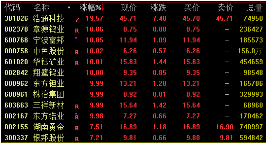有色板块强势拉升,截至收盘,浩通科技大涨19.57%,章源钨业、宁波富邦、中色股份、华钰矿业(维权)、东方钽业、东方锆业等涨停,湖南黄金、银邦股份涨超7%,中国稀土、北方稀土涨超6%。