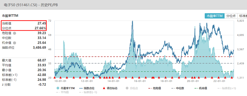 业绩表现总体亮眼的同时,电子板块估值却仍处于历史低位。iFinD数据显示,电子ETF(515260)标的指数(中证电子50指数)1月31日估值(PE,TTM)27.45倍,历史分位点27.66%,低于指数发布以来超70%时间区间。