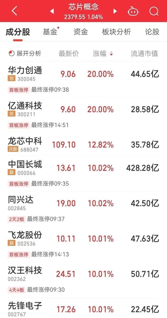 国产芯片今日掀起涨停潮,华力创通、亿通科技20cm涨停,同兴达、中国长城、飞龙股份、汉王科技、先锋电子、瑞芯微、苏州高新纷纷涨停,龙芯中科、国盾量子冲高。