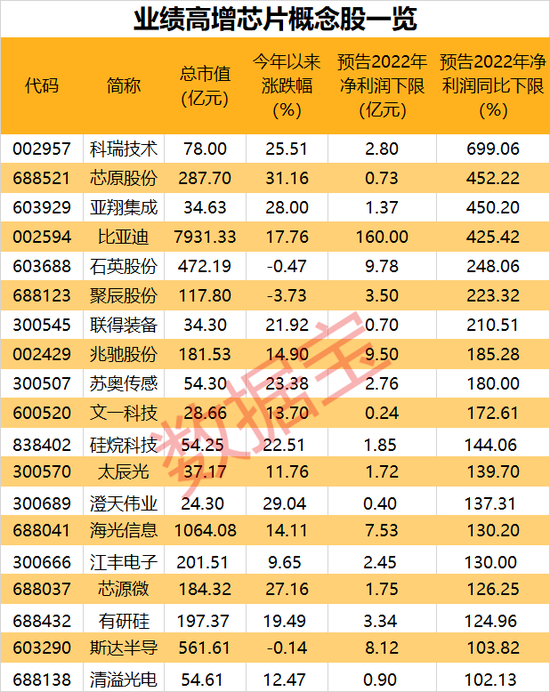 业绩公告来看,232股公告了2022年业绩,其中预增65股、扭亏17股。按照业绩预告下限来看,业绩预增股中,比亚迪、立讯精密、兴发集团、北方华创预告净利润金额居前,分别为160亿元、95.45亿元、58亿元和21亿元;预告净利润增幅下限居前的有科瑞技术、芯原股份、亚翔集成、比亚迪,分别增长6.99倍、4.52倍、4.5倍和4.25倍。
