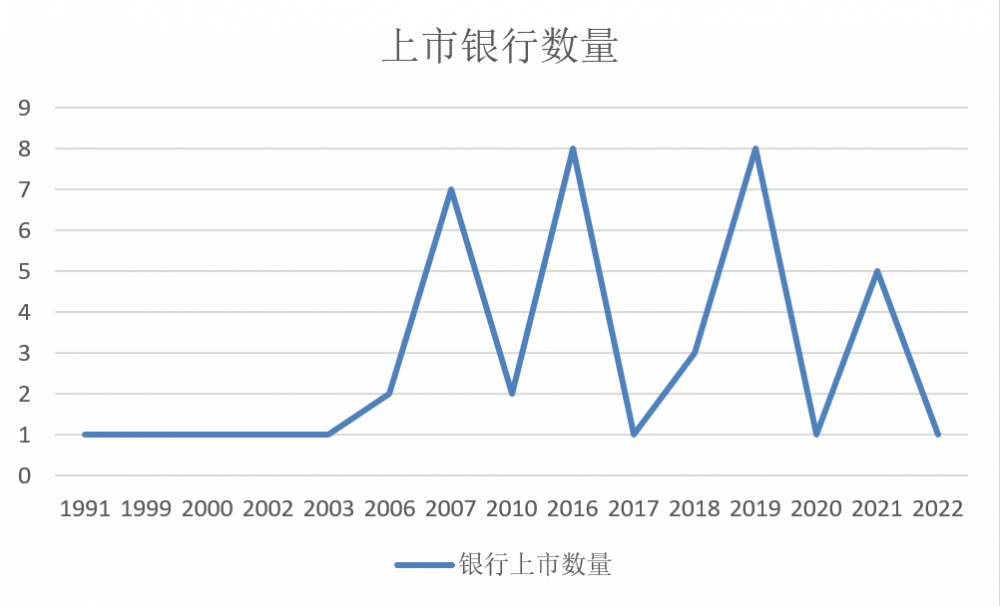 从每年上市的数量来看,银行上市经历了三个高峰期,即2007年、2016年、2019年,分别有7家、8家、8家银行上市。从1991年到2021年的31年间,有17年间没有一家银行成功上市。目前,银行上市的速度处于低位,2022年仅有兰州银行一家成功上市。