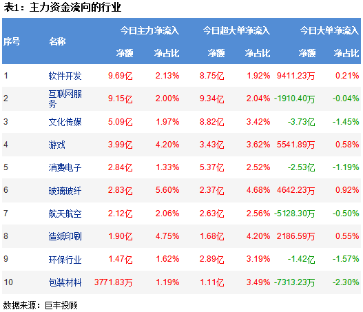 从两市行业板块资金流向来看,软件开发板块获主力资金净流入9.69亿,互联网板块获主力资金净流入9.15亿,文化传媒板块主力资金净流入5.09亿,游戏板块主力资金净流入3.99亿,消费电子板块主力净流入2.84亿。