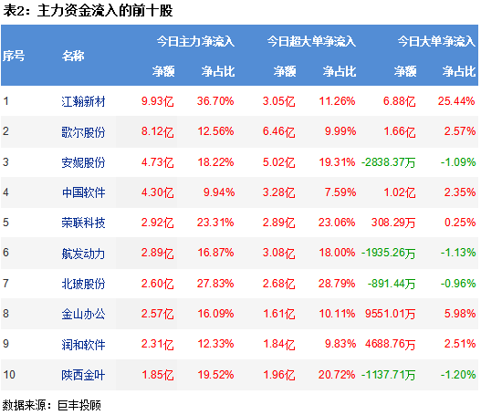 从两市个股主力资金流向来看,江瀚新材获主力资金净流入9.93亿,歌尔股份获主力资金8.12亿净流入,安妮股份(维权)获主力资金净流入4.73亿,中国软件获主力资金净流入4.30亿,荣联科技(维权)获主力资金净流入2.92亿。