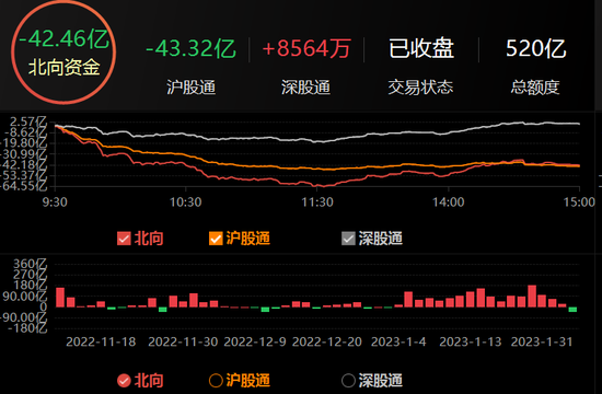 北向资金全天净卖出42.46亿元,结束连续17个交易日净买入,其中沪股通净卖出43.32亿元,深股通净买入0.86亿元。