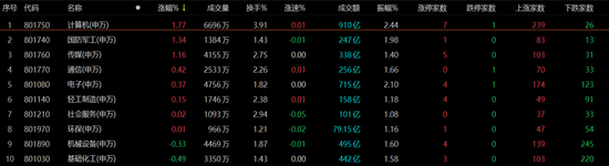 今日,大盘整体震荡调整,计算机板块表现相对强势。从申万一级行业指数来看,该板块以1.77%的涨幅领涨,板块内239只个股收涨,26只个股收跌。
