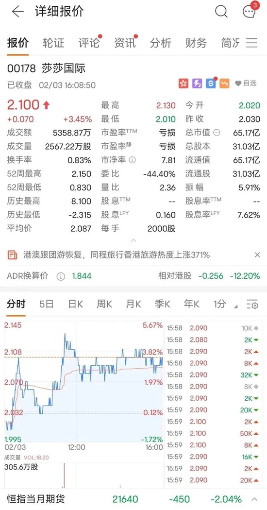 受此消息影响,香港旅游、零售相关上市公司股价走强。莎莎国际盘中涨近5%,收盘涨逾3%;香港中旅收盘涨6.59%,大家乐集团等跟涨。