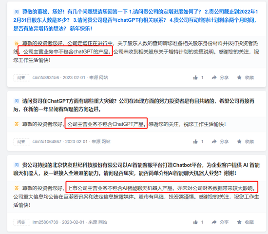 福石控股近期在互动平台被投资者轮番询问是否涉足AI智能聊天机器人、ChatGPT等概念,尽管公司回复称“主营业务不包含AI智能聊天机器人产品”“主营业务不包含ChatGPT产品”,但公司股价今日仍被推至涨停。