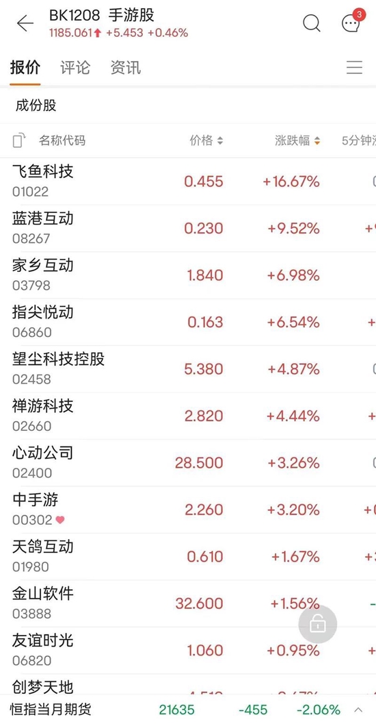 2月3日,港股手游股一片飘红。祖龙娱乐收盘涨逾9%,指尖悦动涨逾6%,禅游科技涨逾4%,中手游、心动公司、腾讯控股、网易-S等跟涨。