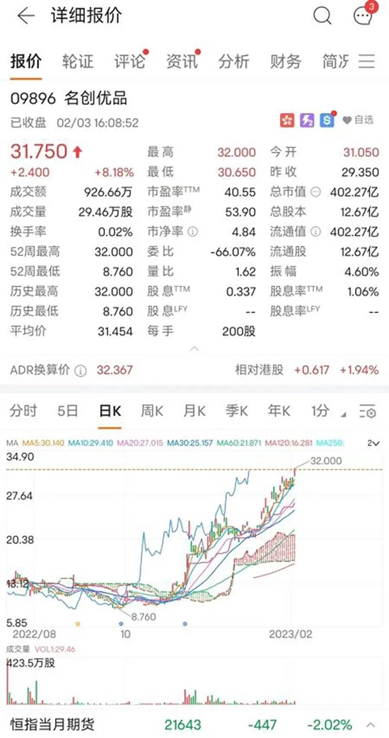 今日名创优品再度跳空上扬,盘中触及32港元/股的历史高点。自去年10月低点以来,名创优品股价涨幅高达225%。