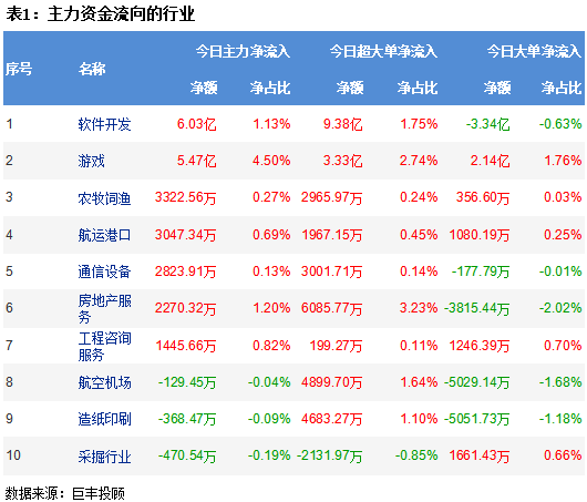 从两市行业板块资金流向来看,软件开发板块获主力资金净流入6.03亿,游戏板块获主力资金净流入5.47亿,农林牧渔板块主力资金净流入3322.56万,航运港口板块主力资金净流入3047.34万,通信设备板块主力净流入2823.91万。