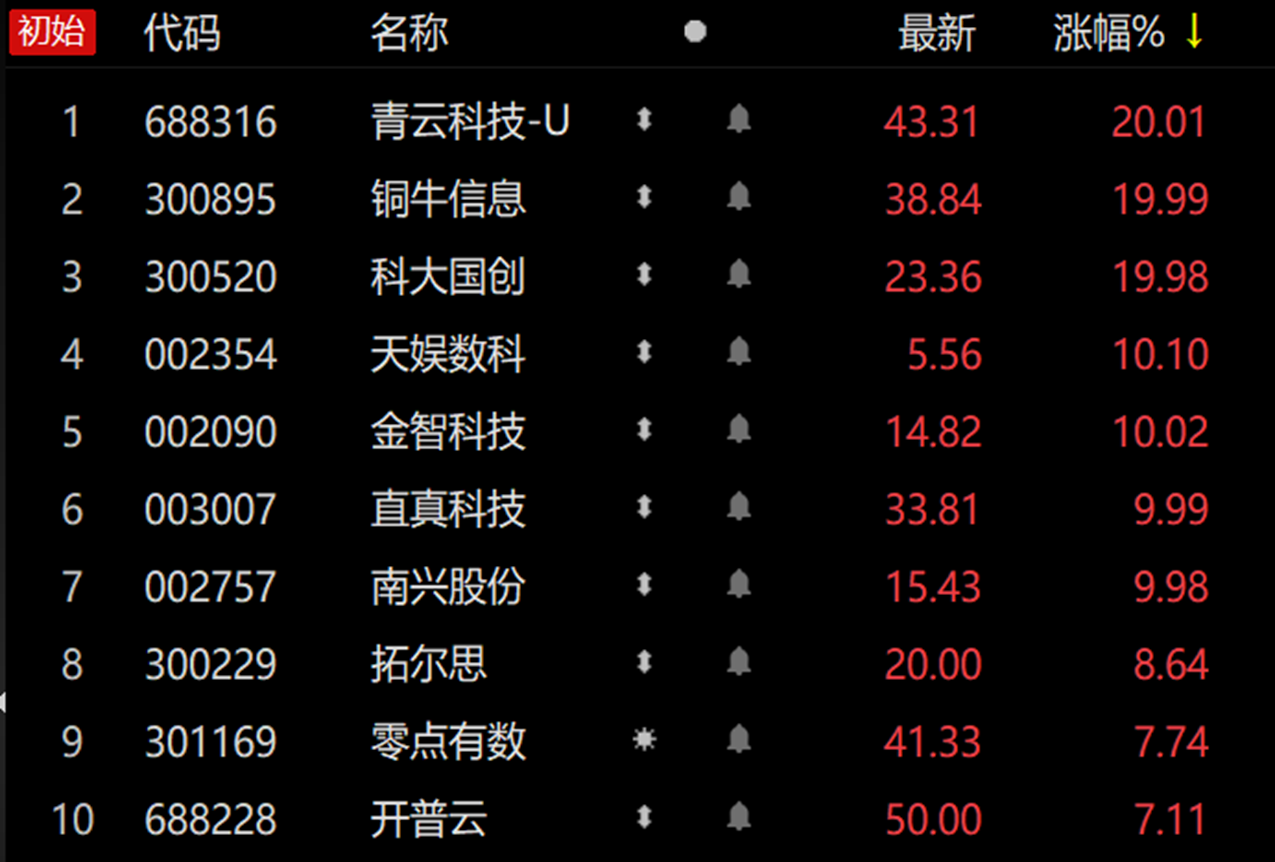 截至收盘,上周大涨的海天瑞声、云从科技等再度涨停;且今日铜牛信息、科大国创、青云科技20CM涨停;天娱数科(维权)、金智科技、直真科技、南兴股份10%涨停——政策与行业共振之下,上涨个股由前期活跃的人工智能开始,进一步向数据要素等概念扩散,数字经济板块呈普涨之势。