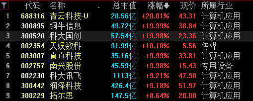 东数西算概念板块大涨3.25%,青云科技、铜牛信息、科大国创3股20cm涨停,天娱数科、直真科技、南兴股份均涨停。