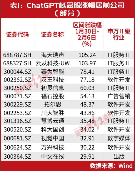 据Wind整理,目前在ChatGPT概念中共有24只成分股,有23只在1月30日至2月6日均录得不同程度的涨幅。其中,海天瑞声和云从科技区间涨幅居前,分别为105.24%和103.97%,此外,赛为智能(维权)、汉王科技和初灵信息等也涨幅居前,尤其是汉王科技,公司同期已连续录得6个一字涨停板,累计涨幅达77%(见表1)。