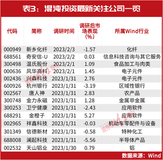尽管没有刻意布局ChatGPT概念公司,但葛卫东在春节后也没有停止寻找布局机会。据梳理,混沌投资在1月30日以来,共参与14家公司的机构调研,从行业属性来看,这些公司普遍属于科技领域的高增长赛道(见表3)。而从2022年业绩预告情况来看,这些公司也普遍属于高增长的公司,如目前预告归母净利润同比增长上限最高的是祥鑫科技,公司预计净利润将最高实现293.24%的增长。