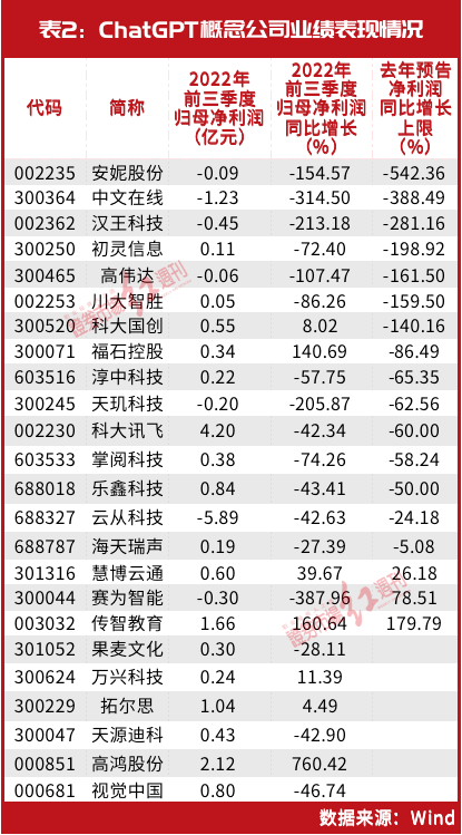 赛为智能并不是个案。据统计,最新完整的财报(2022年三季报)数据显示,目前的24家ChatGPT概念公司有17家在去年前三季度的归母净利润同比下滑,占比超七成,其中赛为智能同比下滑幅度最大为387.96%。此外,目前共有18家披露了2022年业绩预告,其中有15家的预告归母净利润同比增长上限为负,占比超过八成。也就是说,这些公司在2022年业绩表现仍普遍较差(见表2)。