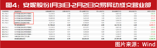 但实际上,也有部分游资正在选择和“赵老哥”相似的操作。仍以安妮股份为例,在“赵老哥”选择退场的同时,部分游资也开启了“卖卖卖”的模式,如在2月3日卖出的前五营业部,其均为1月31日至2月2日期间新进入的游资(见图4)。也是在此之后的次一交易日,即2月6日,安妮股份低开后不久即触及跌停,从这方面看,这些游资很可能是砸盘的主力。
