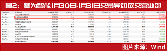而在这之前,已经有顶级游资入驻赛为智能。据梳理,由于在截至1月31日的连续三个交易日内收盘价格涨幅偏离值累计达30%,赛为智能同样披露了交易异动成交营业部,其中买二席位为中信证券上海溧阳路营业部(见图2),据了解,这一营业部为著名游资“孙哥”(原名孙煜)的常用席位,而“孙哥”曾被称为第一游资。