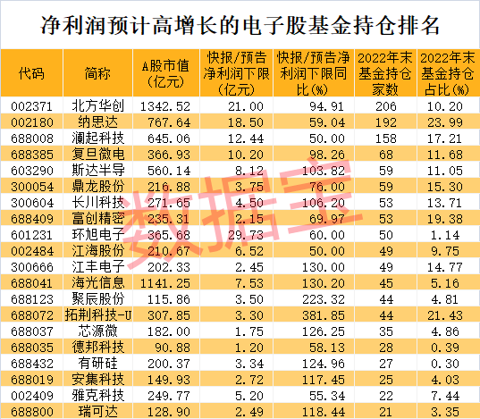 上述净利润高增长的72股中,2022年末合计获得1549只公募基金持仓(注:重复持仓的暂未剔除)。9股获得50只以上基金扎堆重仓,包括北方华创、纳思达、澜起科技、复旦微电、斯达半导等。北方华创、纳思达、澜起科技均获百只基金持仓,基金持仓占流通股比例均超10%。