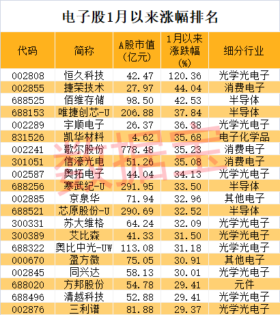 不少电子行业股票近期走出凌厉攻势。数据宝统计,1月以来,72只电子股累计涨幅超过20%,歌尔股份、寒武纪-U、长盈精密、蓝思科技、领益智造等电子行业细分领域龙头名列其中。涨幅最高的前五只股票是恒久科技、捷荣技术、佰维存储、唯捷创芯-U、宇顺电子。恒久科技由于信创、区块链、信息安全等热门题材加持,走出了翻倍行情,1月16日至2月1日期间,一度收获8连板。