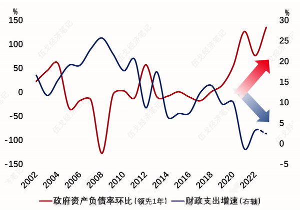 三年来受到疫情、地产等多重拖累,我国政府尤其是地方政府的资产负债率显著抬升并创新高。历史上,前期的资产负债表受损都将滞后地掣肘下一年财政支出的力度。近期中央强调“着力扩大有收入支撑的消费需求、有合理回报的投资需求、有本金和债务约束的金融需求”,或也预示财政支出的强度。