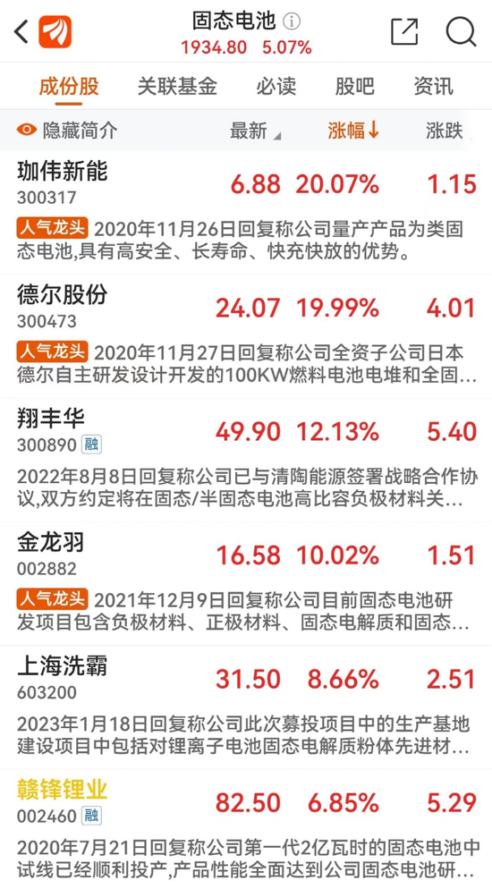 二级市场上,固态电池概念板块近期逐渐发酵,相关概念股相继暴涨。截至截稿时,珈伟新能、德尔股份20CM涨停,赣锋锂业也涨逾7%,而金龙羽则拉出两连板。