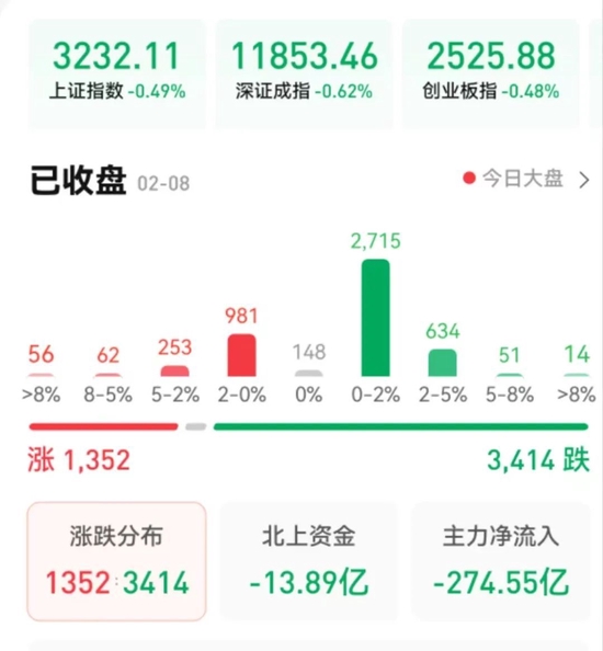 周三(2月8日),A股三大股指震荡走低。截至收盘,上证指数跌0.49%报3232.11点,深证成指跌0.62%报11853.46点,创业板指跌0.48%报2525.88点;两市合计成交8047亿元,北向资金净卖出13.89亿元,连续4个交易日流出,累计净卖出金额达100.39亿元。总体上看,两市个股跌多涨少。其中,涨停个股达35只,跌停个股6只。