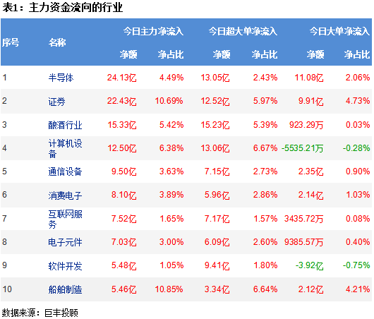 从两市行业板块资金流向来看,半导体板块获主力资金净流入24.13亿,证券板块获主力资金净流入22.43亿,酿酒板块主力资金净流入15.33亿,计算机设备板块主力资金净流入12.50亿,通信设备板块主力净流入9.50亿。