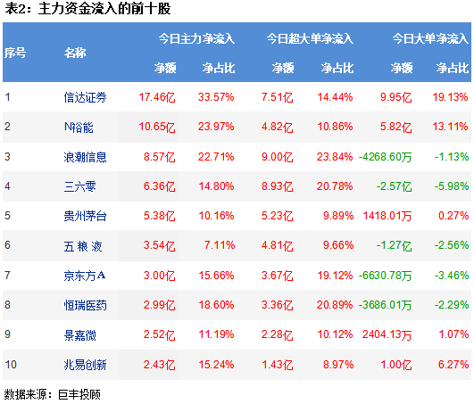 从两市个股主力资金流向来看,信达证券获主力资金净流入17.46亿,N裕能获主力资金10.65亿净流入,浪潮信息获主力资金净流入8.57亿,三六零获主力资金净流入6.36亿,贵州茅台获主力资金净流入5.38亿。