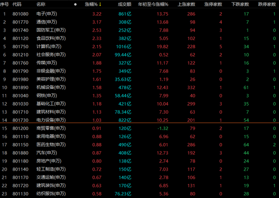 31个申万一级行业全部飘红,电子、通信、国防军工涨约3%,食品饮料、计算机、社会服务、传媒、非银金融板块涨约2%。