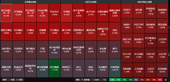 个股板块呈现普涨态势,沪深两市共计4214只个股收涨,涨停股35只;718只个股收跌,跌停股9只。板块而言,半导体、信创等科技方向,以及白酒等消费领域,尤受资本青睐。