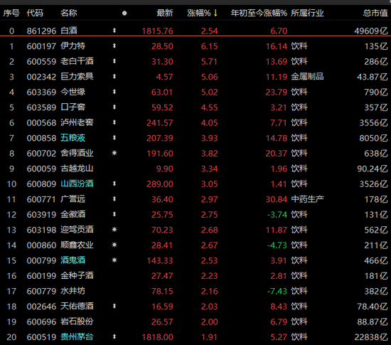 白酒、啤酒概念涨势不错,燕京啤酒涨幅超过7%,五粮液、泸州老窖涨约4%,贵州茅台收涨1.91%报1818元/股。