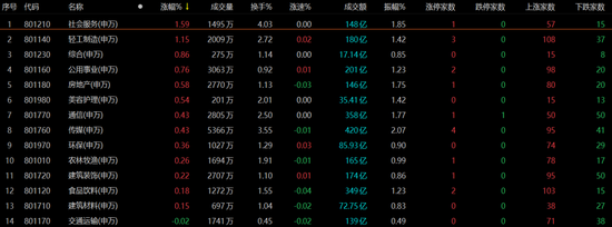 社会服务板块以1.59%的涨幅领涨各行业板块,凯文教育10CM涨停,同庆楼、零点有数、金陵饭店、晋江酒店涨超6%,君亭酒店、兰生股份、西安饮食涨超5%。