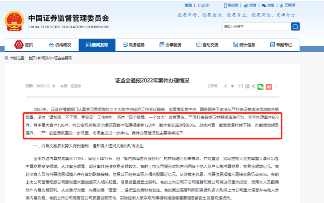 2月10日,证监会通报2022年案件办理情况,2022年,证监会全年办理案件603件,其中重大案件136件,向公安机关移送涉嫌犯罪案件和通报线索123件,案件查实率达到90%。总体来看,案发数量持续下降,办案质效明显提升,“严”的监管氛围进一步巩固,市场生态进一步净化。