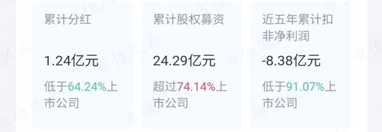 根据市值风云App吾股大数据给出的信息,公司自2010年9月上市以来,累计分红仅1.2亿,但募资却高达24亿,近五年累计扣非净亏损8.4亿。