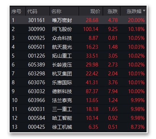 今日A股机械设备板块上演涨停潮,唯万密封20%涨停,众合科技、航天晨光、拓山重工、长龄液压、杭叉集团等涨停;工程机械行业龙头三一重工也涨停,市值超过1500亿元;徐工机械涨近9%,恒立液压、中联重科涨逾6%。