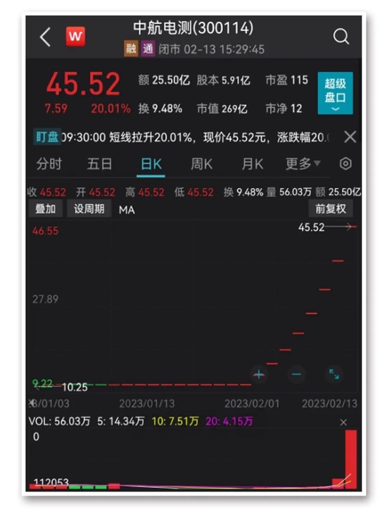 散户投资者能够“买到”的背景是,中航电测今日成交急剧放量,全天高达25.5亿元。上周五该股成交额为3.65亿元,而上周四的成交额仅7736万元。再往前推,中航电测今年1月份的日成交额均不足1亿元。这意味着,中航电测今日的成交额较此前暴增数十倍。