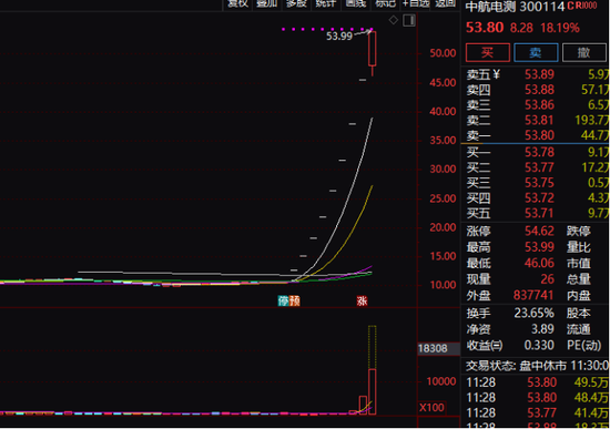 兔年以来最牛个股中航电测在连续8个“20厘米”涨停后今天上午盘中开板,截至午间收盘,涨18.19%,报53.8元/股。与此同时,该股成交进一步放量,半天成交近70亿元。