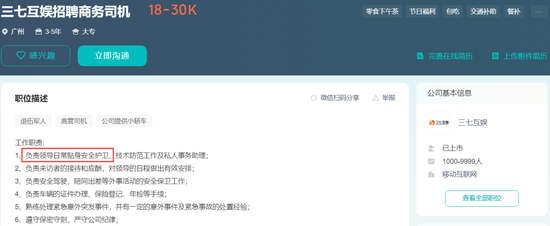 除乐歌股份外,记者注意到,还有天能股份、三七互娱等招聘安全护卫(保镖)、商务司机(工作要求包含领导日常贴身安全护卫),招聘信息显示,上述岗位平均月薪在2万元上下。