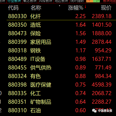 保险、造纸、医药、有色、钢铁、煤炭、电力、银行、酿酒等板块走强,旅游、农业、券商、半导体、汽车等板块走弱