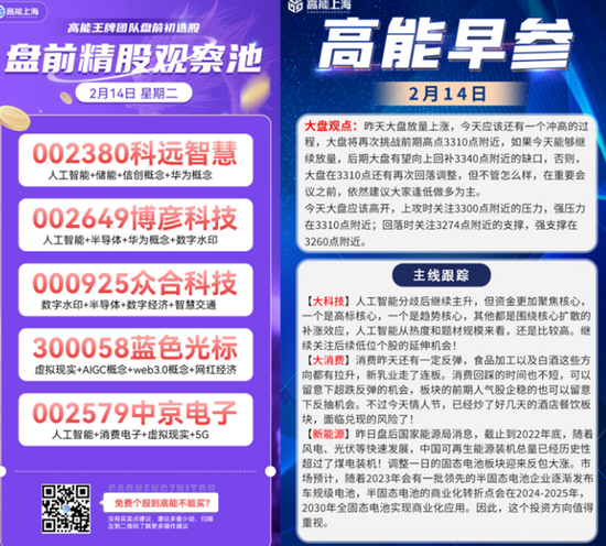 以“高能智投”2月14日早间发布的盘前精股观察池为例,其列示的科远智慧此前已连续两日涨停,但当日开盘后则高开低走,收盘下跌逾8%。