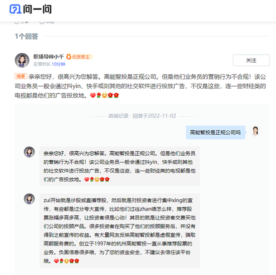 为打消潜在客疑虑,张助理反复强调“高能智投”是监管部门批准的首批证券投资咨询机构,正规有实力,可以“点对点”带客户操作股票。但该助理是否具备投顾资格尚未可知。