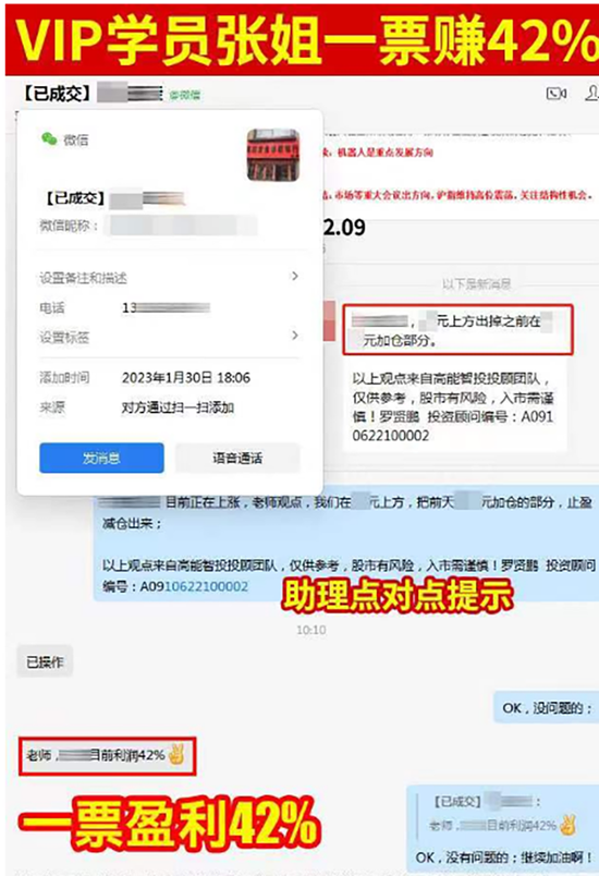 “明确的买入、卖出点位指导,您要跟上操作吗?”每天早上,“高能智投”的张助理都会通过企业微信向记者询问产品购买意向,同时还会附上一些颇具诱惑力的客户赚钱案例截图。如“高大哥跟我们合作之后,不到半个月的时间赚68459元,目前收益率已经达到44%”“学员张姐,一只票在专员的辅助下,把握到42%的涨幅”。