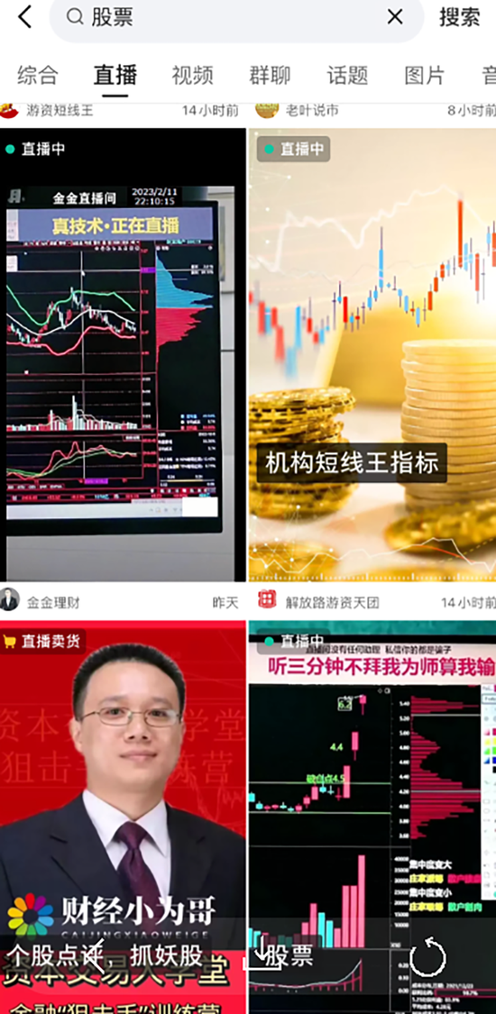 不过,仍有一些财经主播“昼伏夜出”。连续几天,记者在晚上10点后打开某短视频软件,搜索“股票”二字,会弹出大量财经主播。