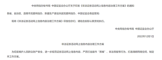 2022年12月下旬,中央网信办秘书局、中国证监会办公厅印发了《非法证券活动网上信息内容治理工作方案》,进一步规范证券活动网上信息内容,严厉打击股市“黑嘴”、非法荐股等行为。通知明确:通过各地各有关部门共同努力,2023年3月底前,现有网上涉股市“黑嘴”、非法荐股的信息、账号和网站平台得到基本处置;2023年6月底前,证券业务必须持牌经营的要求得到落实,网上证券信息内容明显改善,非法证券活动多发频发态势得到有效遏制。