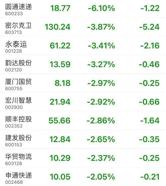 物流板块今日也同步走弱,圆通速递跌超6%,韵达股份、顺丰控股、申通快递等纷纷跟跌。