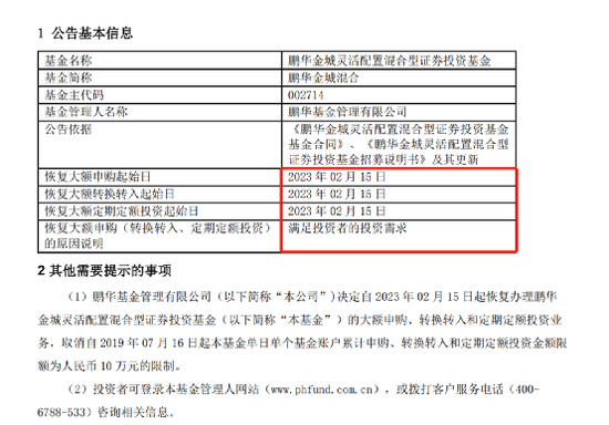 不仅如此,近期还有不少基金都宣布“恢复大额申购”。如鹏华金城灵活配置基金也宣布,2月15日起恢复办理大额申购等业务。