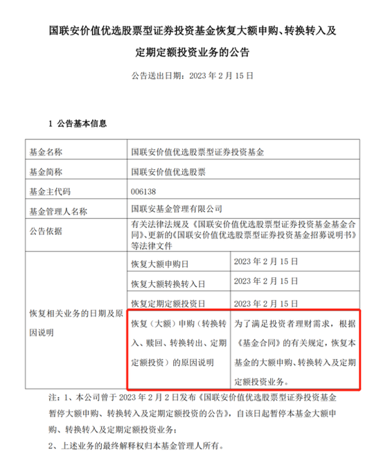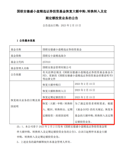 国联安旗下两只基金——国联安德盛小盘精选和国联安价值优选股票基金均宣布恢复大额申购、转换转入及定投业务,理由都是为了满足投资者的理财需求。而这两只基金都是2月2日发布过暂停大额申购等业务的公告。
