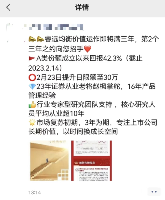 目前,部分银行渠道已经陆续将睿远均衡价值的持续营销提上日程,通过朋友圈等渠道通知客户首个三年持有期即将迎来开放以及调高大额申购上限的事宜。