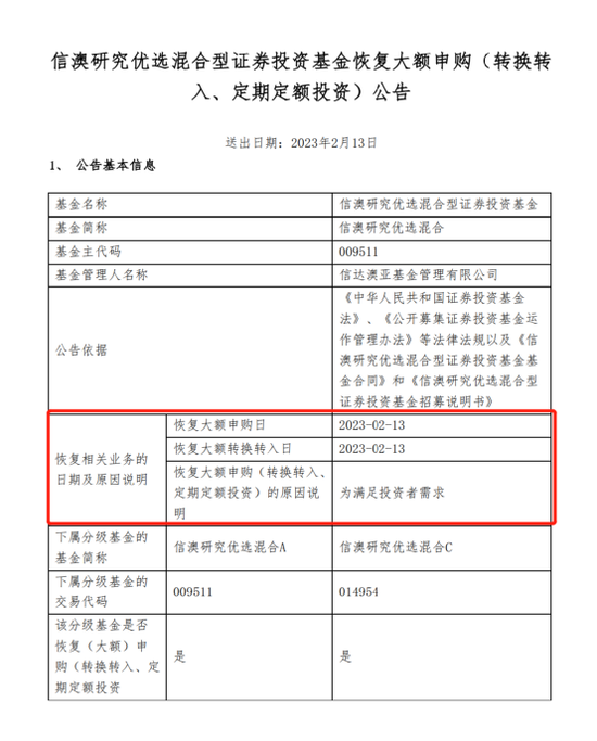 信达澳亚基金宣布,自2023年2月13日起,基金管理人取消对本基金的大额申购、转换转入及定期定额投资的限制,恢复办理本基金的大额申购、转换转入及定期定额投资业务。原2022年11月28日刊登的《信澳研究优选混合型证券投资基金暂停大额申购(转换转入、定期定额投资)公告》自2023年2月13日起不再执行。