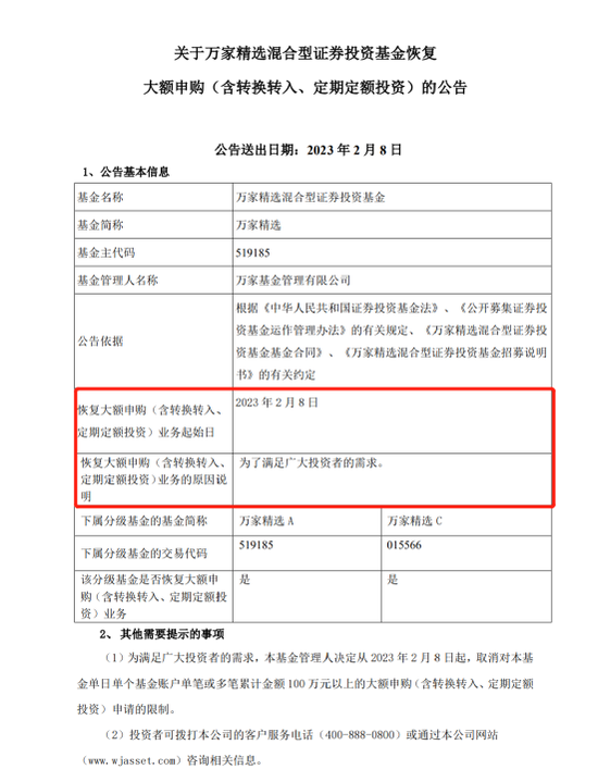 公告显示,为满足广大投资者的需求,该基金管理人决定从2023年2月8日起,取消对万家精选混合基金单日单个基金账户单笔或多笔累计金额100万元以上的大额申购(含转换转入、定期定额投资)申请的限制。